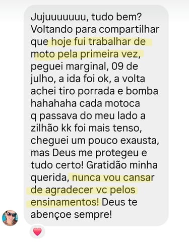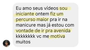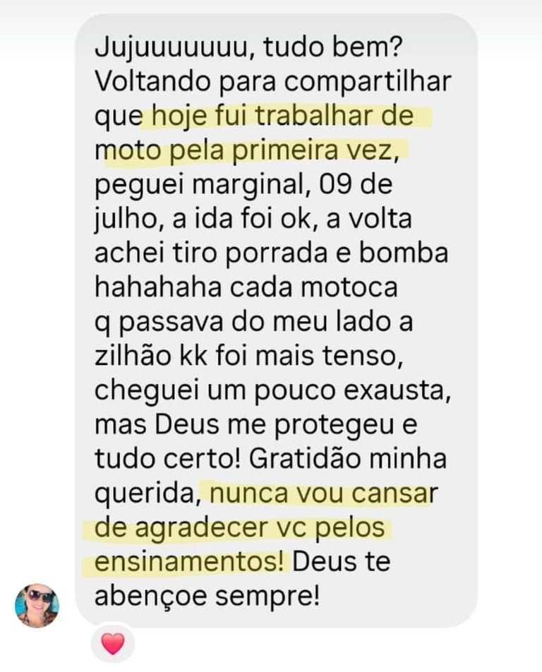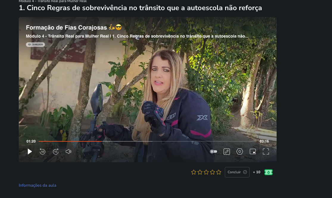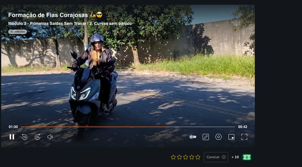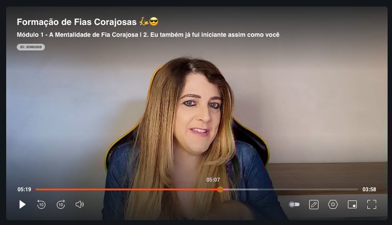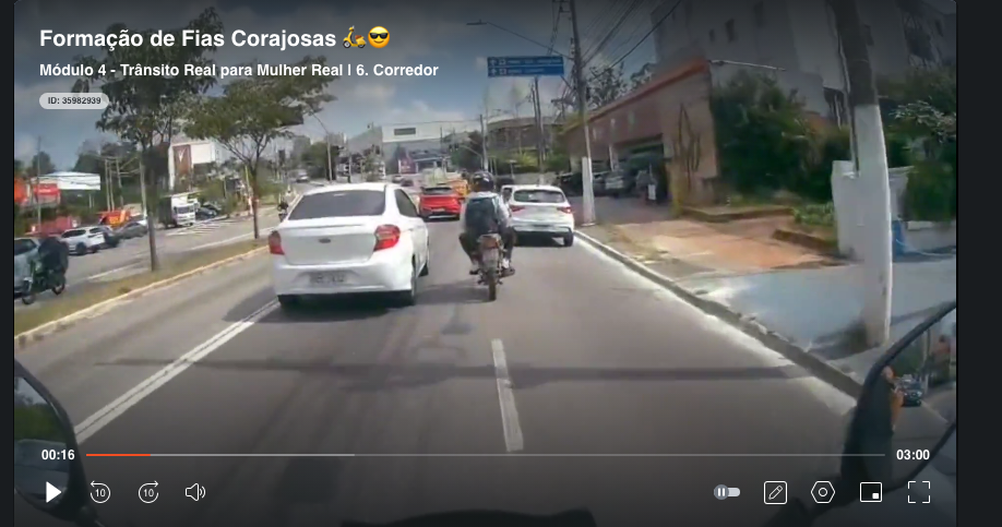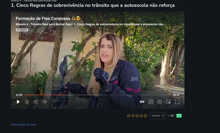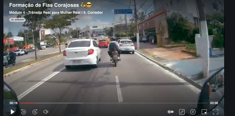 Ao entrar na Formação de Fias Corajosas você tem acesso imediato às 16 aulas — da mentalidade até o trânsito real. Tudo no celular, no seu ritmo, sem prazo pra terminar e comigo do seu lado em cada etapa.