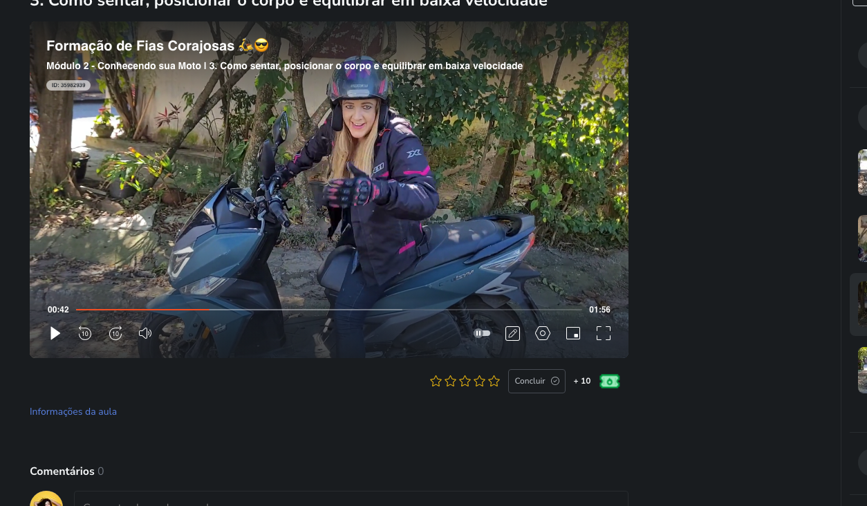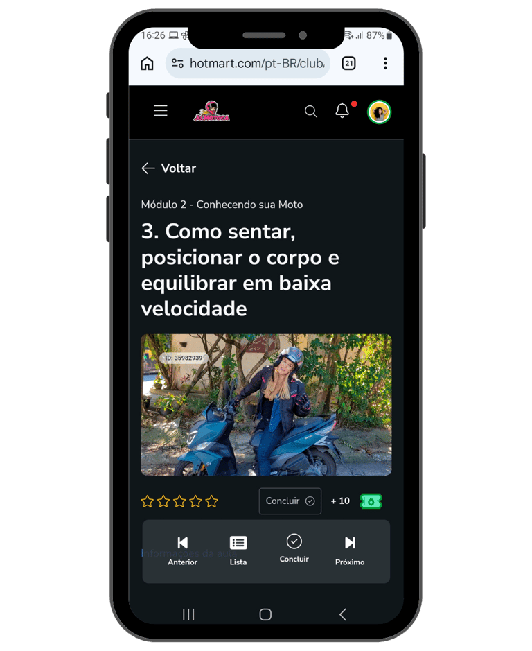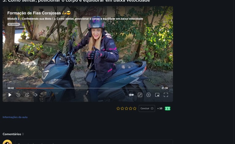 São 16 aulas em vídeo, organizadas na ordem que fez diferença pra mim: começo pelo lado emocional do medo, passo pelo domínio técnico da moto e chego no trânsito real — preparada e segura.
